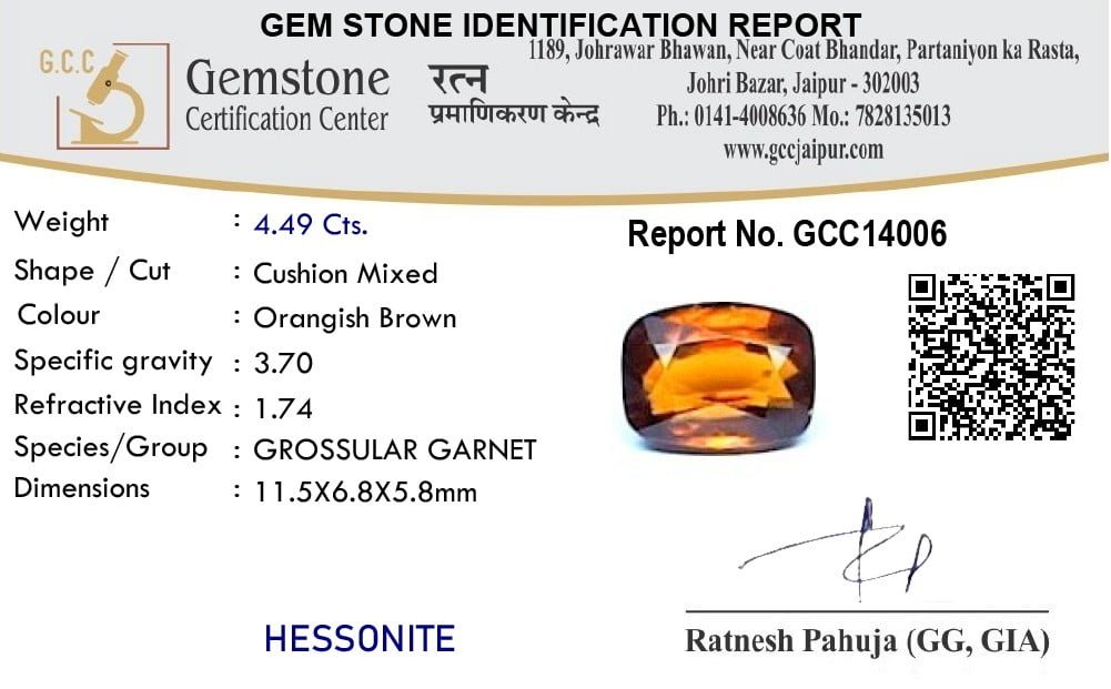 Ratan Bhagya's Hessonite gems or Gomed stones are handpicked, flawlessly cut, and polished into a perfect geometric shape. The weight of the stone is 4.49 Carat (4.8941 Ratti). Gomed helps mitigate the onset of Rahu and solves hindrances in personal as well as professional life.”