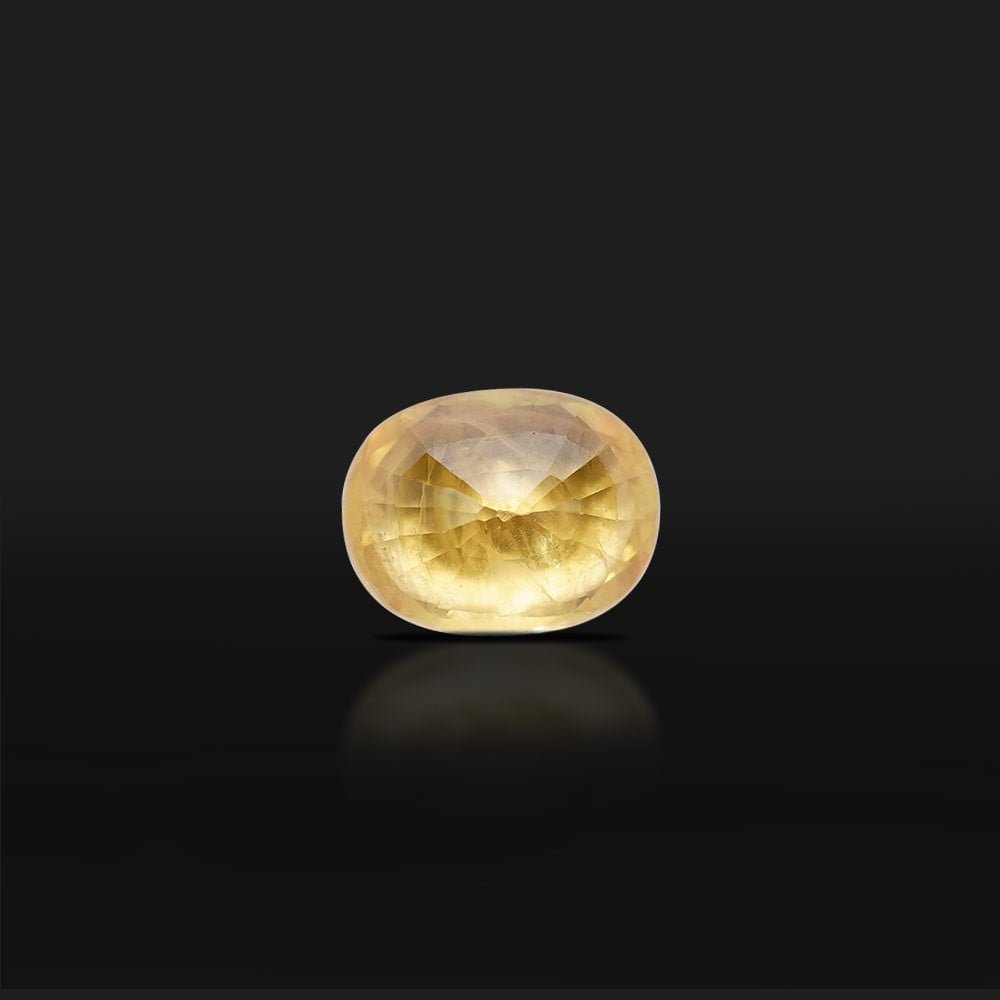 Yellow sapphire is a naturally occurring variant of sapphire in the corundum family. The trace amounts of iron and aluminum in a sapphire contribute to its yellow color. Sapphire is an extremely hard and durable stone and influences the mighty Jupiter. Therefore, Yellow sapphire or Pukhraj is a significant stone in Vedic astrology. It blesses the wearer with great luck, wealth, and happiness. It enables the person to make full use of their concentration and focus, as a result, this stone is heavily recommended for students. It improves decision-making capabilities and boosts confidence. Pukhraj of the best quality helps in healing physical ailments. Problems related to the organs like stomach, lungs, and nervous system are solved using this stone. Find 5.25 Carat Carat yellow sapphire at Ratna Bhagya. We provide the certification of purity and authenticity for the best gemstones.”